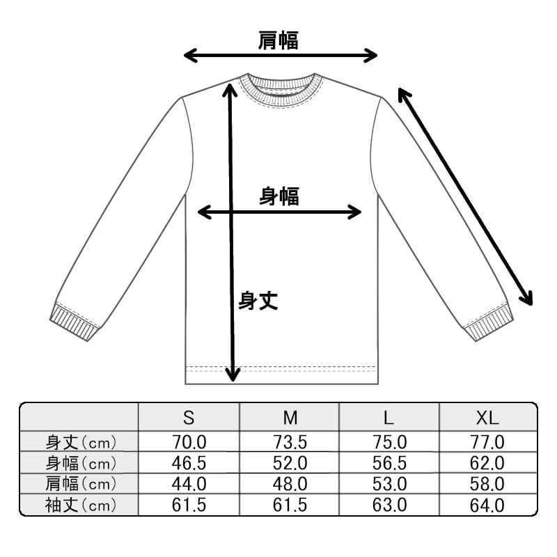 XLサイズ : 着丈約77.0cm / 身幅約62.0cm / 肩幅約58.0cm / 袖丈約64.0cm